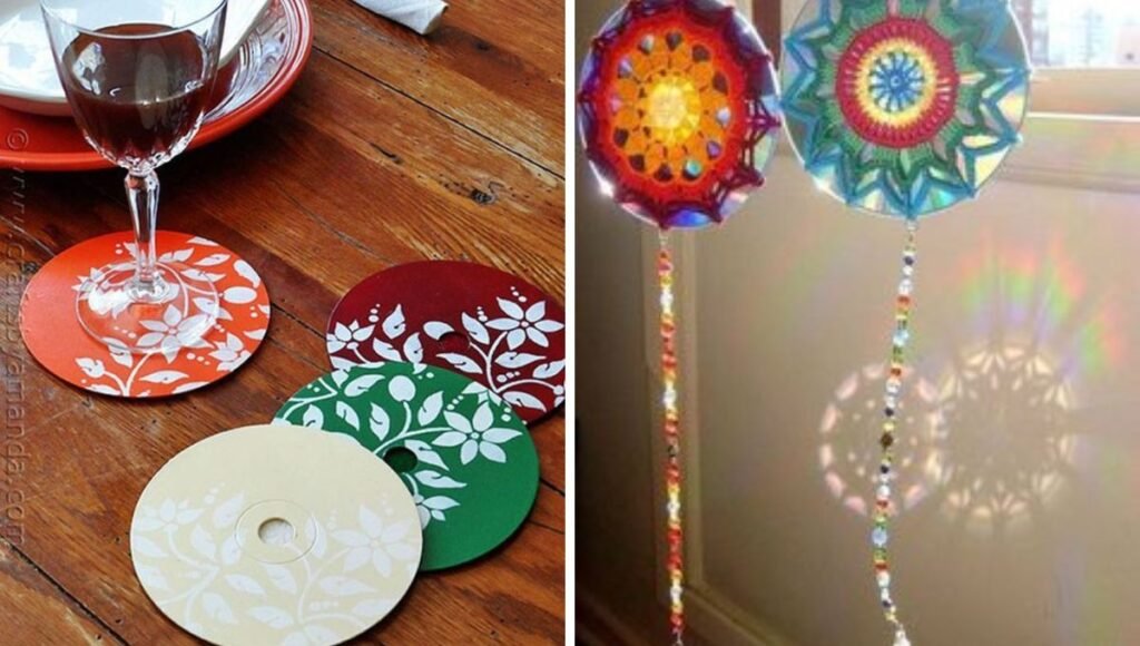 Móviles o atrapasoles: Corta CDs en figuras o déjalos enteros y cuélgalos cerca de una ventana. Reflejan la luz del sol creando un efecto arcoíris.